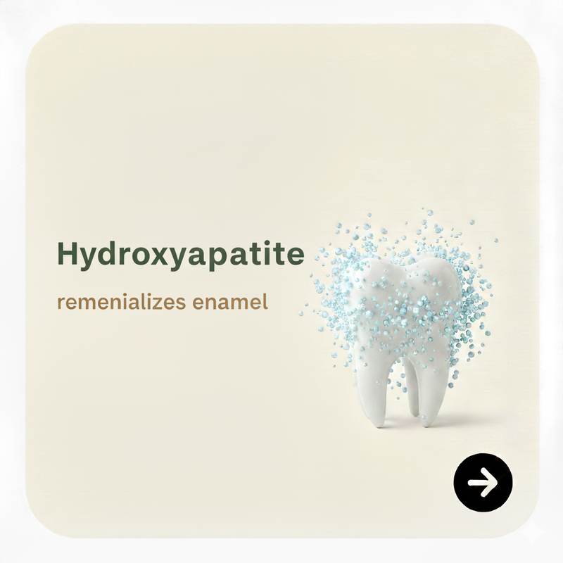 A naturally occurring teeth and bone mineral, Hydroxyapetite prevents cavities from forming, reduces tooth sensitivity, improves gum health and finally, whitens teeth